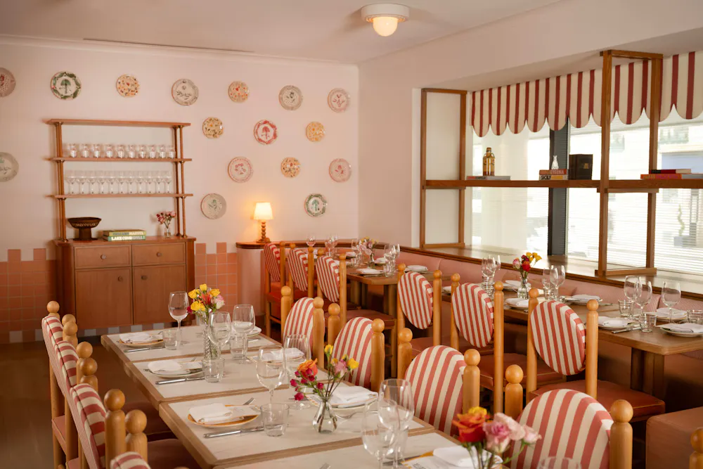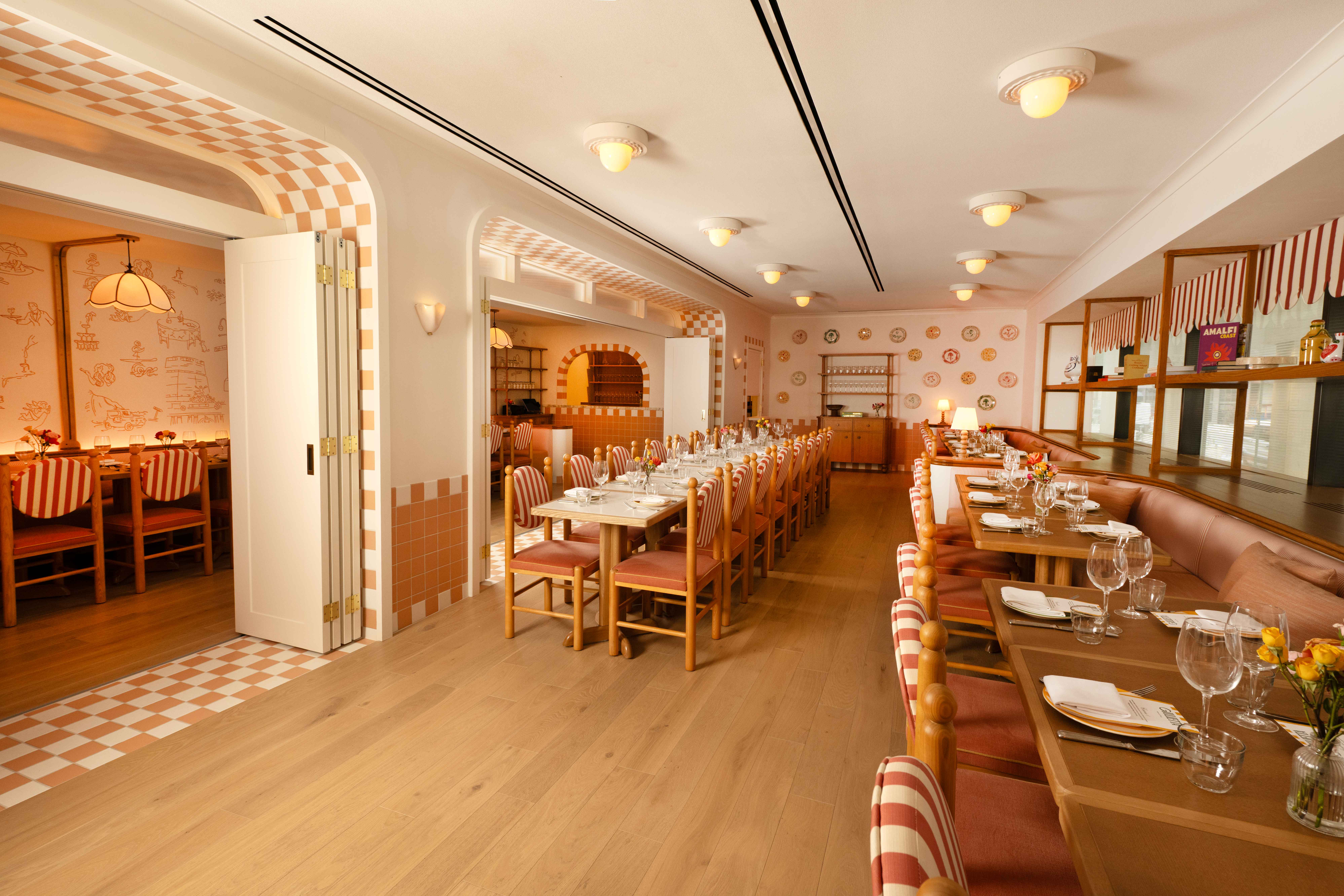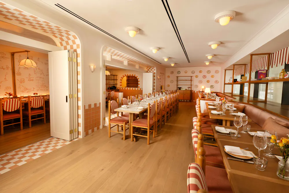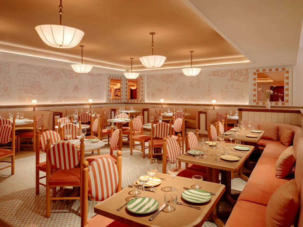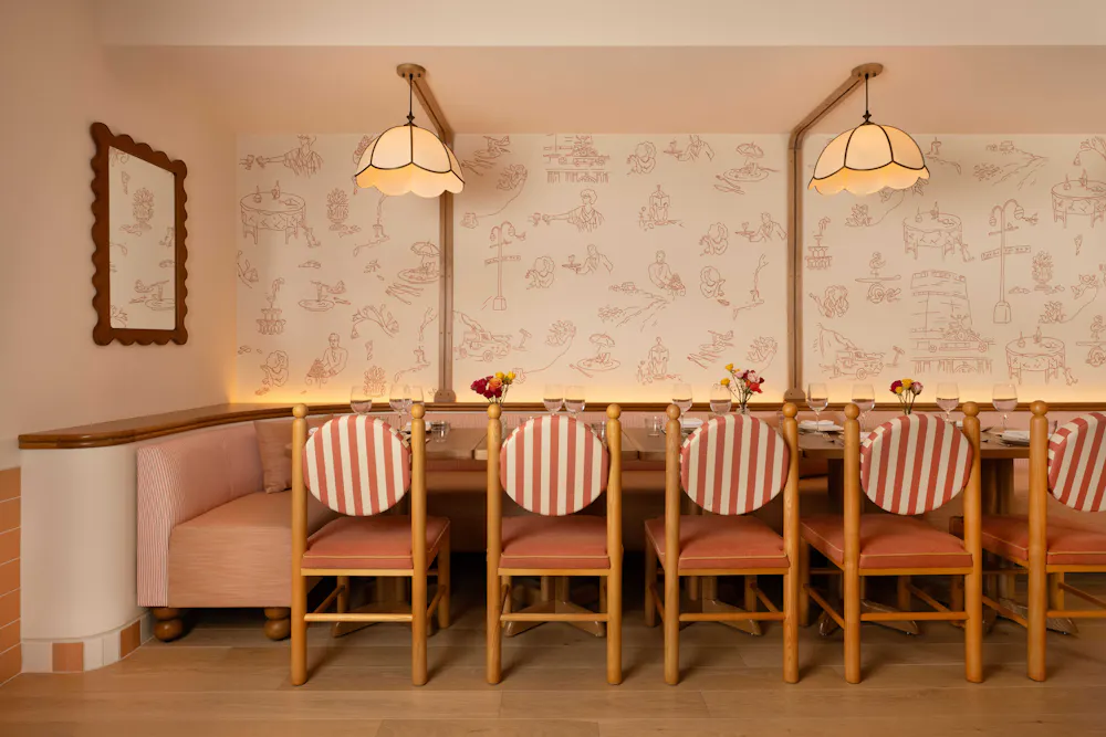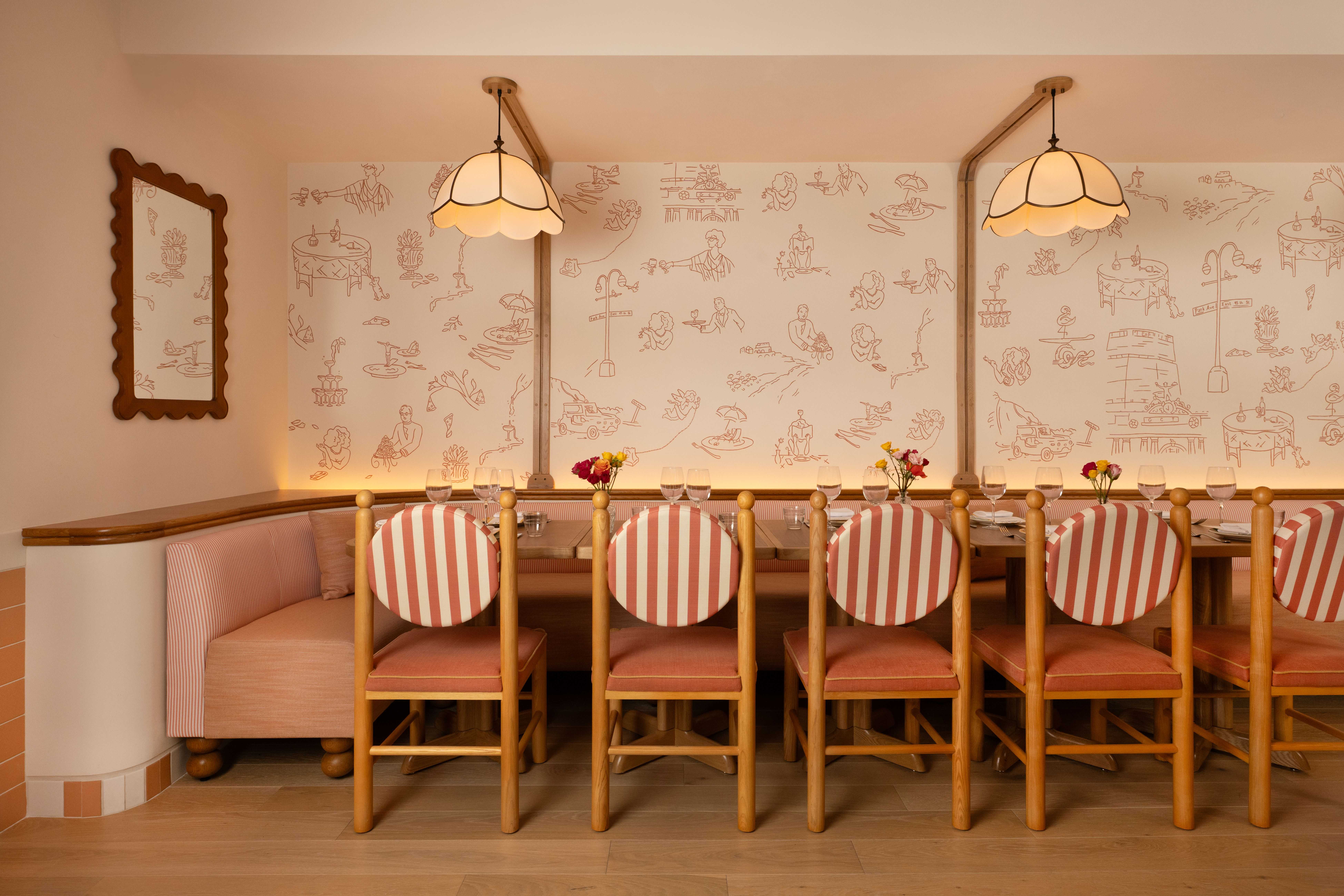 Located toward the back of Giulietta’s main dining room, Portofino East is one of two fully private dining rooms that evoke the spirit of a coastal holiday - no passport required. The room’s backdrop is a custom hand-painted mural, depicting the chic, playful world of “Giulietta”. Scalloped pendant lighting warms the space, while striped terracotta upholstery evokes the bold, coastal design of Italian beach clubs. The room features a designated bar with a pass-through window, where a spritz or a sbagliato are within easy reach. Sliding doors offer complete privacy for corporate dinner meetings and exclusive social gatherings alike.